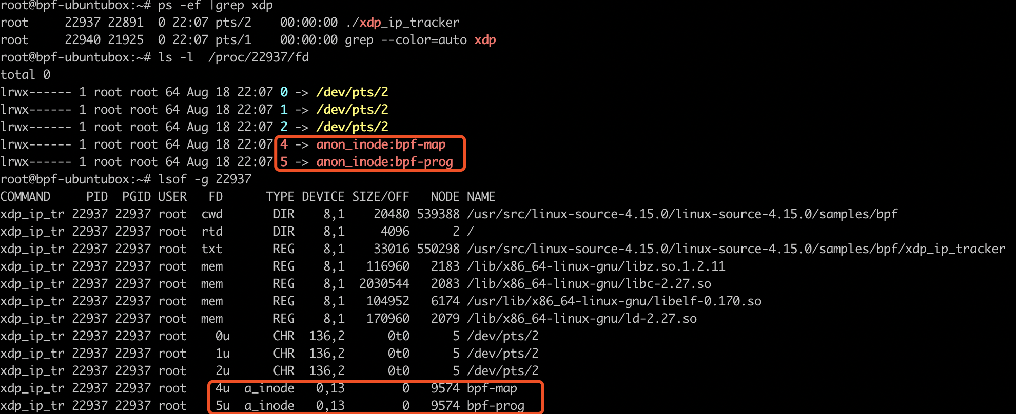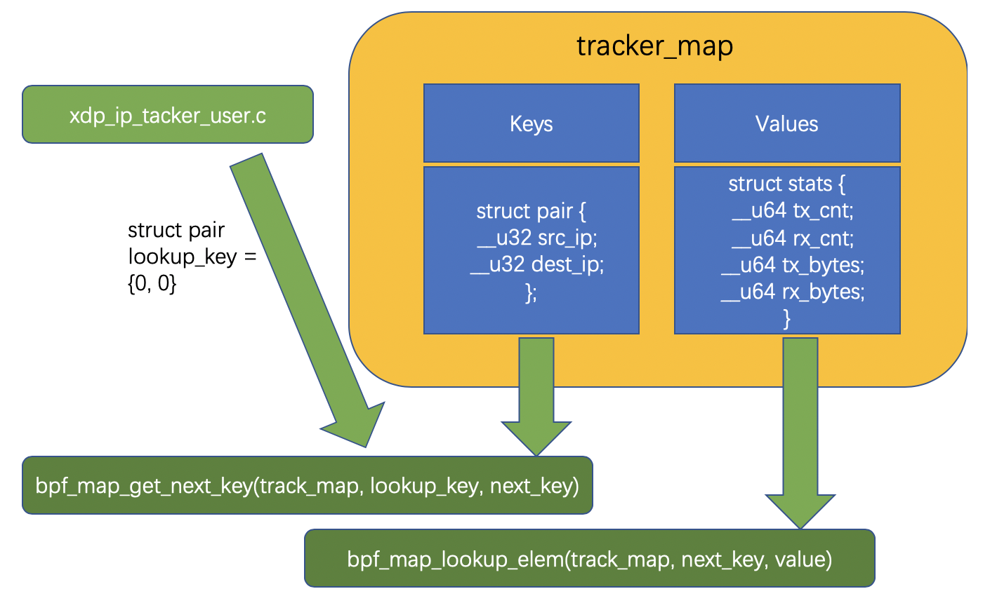 - 另一个是运行在用户空间的程序,主要功能为读取上面内核空间创建出的BPF Map里的数据,并进行格式化展示,以演示BPF Map在两者之间进行数据传递。