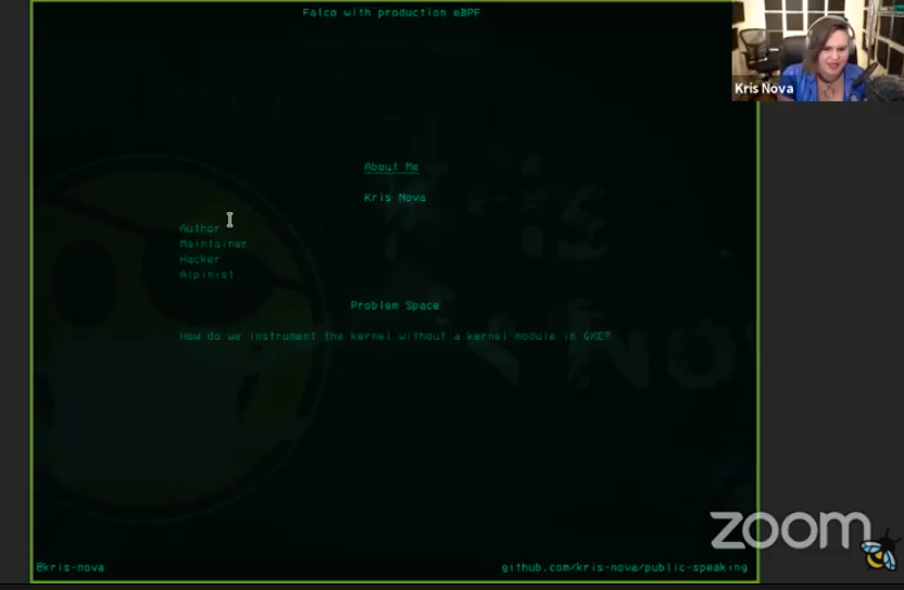 来自Sysdig Kris Nova,是CNCF唯一一个关注云原生运行时安全的Project——Falco的Core Maintainer之一,Live Coding党之一,也是我见过的最cool最活泼的技术女神,之前介绍Falco的博文特别介绍过她,也有她以往的talk视频,值得一看。这次talk一开始女神就皮了一下,说是特别感谢Thomas的耐心,因为她前前后后换了好多次主题,临近大会了还没定下来,最终给了一个听上去很大也很笼统的主题——Falco with prodution eBPF,肯定还是安利Falco,毕竟是基于BPF技术作系统追踪的集大成者。还有一个亮点,她是整场summit是唯一一个直播讲Keynote(其他人貌似都是放之前录好的keynote录像,也有可能是因为主题没提前定下来导致的),忍不住上一张女神字符化PPT的靓图。