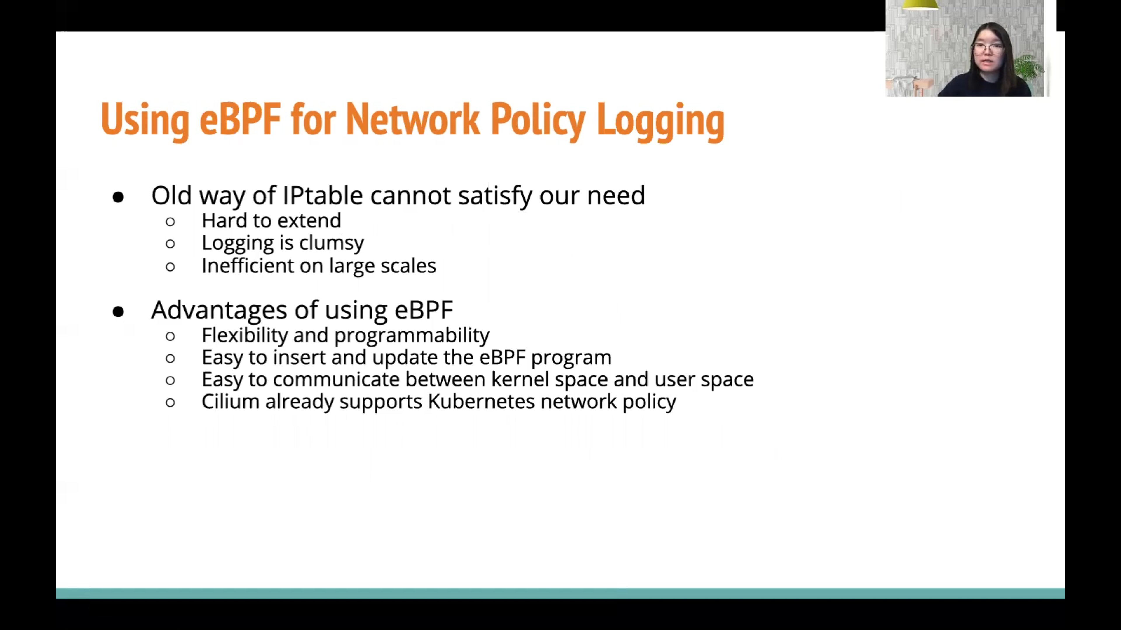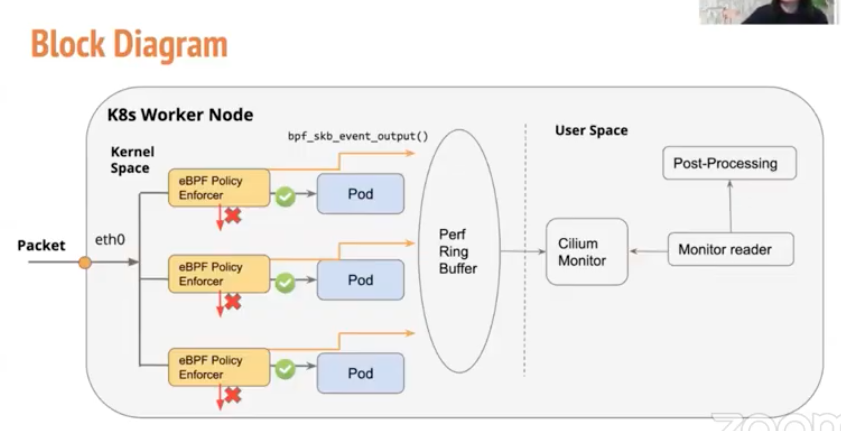第四个是来自Google的华人女生Zang Li,看上去很年轻,真是年少有为。她带来的主题是Kubernetes Network Policy Logging with eBPF,即如何基于eBPF实现k8s网络策略的追踪日志,主要讲的GKE上如何实现可视化网络策略,通过记录每次网络策略的验证log,形成policy verdict event,再吐到下游平台产生观测价值。其中内核空间使用了bpf_skb_event_output()函数,将event信息发送给Perf Ring Buffer,再配合用户空间的Cilium Monitor技术栈,拉取数据,进而二次处理,由于会查看每个网络数据包,期间会有聚合多个网络数据包结果后再发送的操作。更多Google和Cilium合作的信息可以看这里。