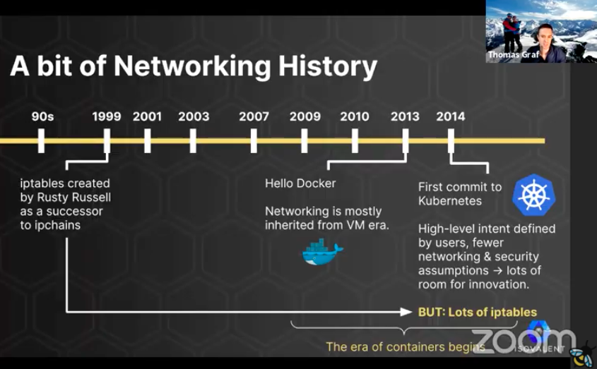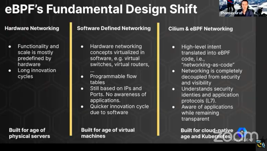 大会压轴讲Keynote的当然是主持人Thomas,他带来的主题是The Future of eBPF-based Networking and Security,看着就要发大招。上来介绍了Networking网络发展史,从上世纪90年代iptables的诞生到近十年最火的网络虚拟化。然后讲了eBPF发展演进史(我自己整理一版BPF技术发展史),提到eBPF技术的设计基础发生了变化,从原始的裸金属,到传统虚拟机,再到目前的由Kubernetes技术引领的云原生时代。