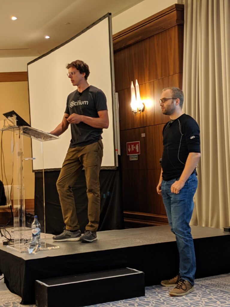 - Cilium本家的口音小哥Martynas又来了,好像还是老话题讲Cilium基于eBPF的网络负载均衡原理,貌似连ppt都跟之前差不多。放一张他和Daniel Borkmann(拍照要记得插袋的那个)的靓图,他俩上除了Thomas之外,是最经常露脸的高工了。