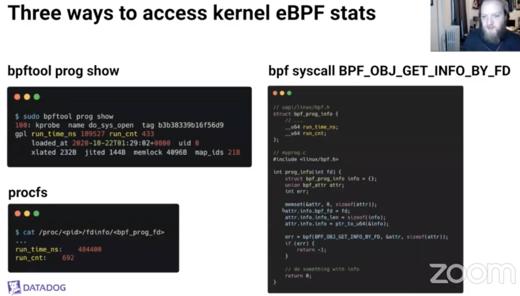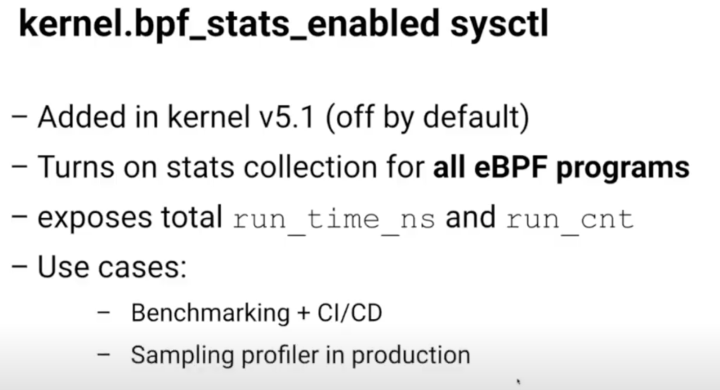 第一个是来自Datadog大胡子老哥Bryce Kahle,他的主题是How and When You Should Measure CPU Overhead of eBPF Programs,本质上就是如何Profile eBPF程序,一旦开始大量写程序,Profile这件事情一定会提上日程。他提到一个系统参数kernel.bpf_stats_enabled,是用来开启收集eBPF程序的状态信息,主要是run_time_ns和run_cnt这两个参数,前者代表内核累计花了多少时间运行这个BPF程序,后者是这个BPF程序累计运行了多少次: