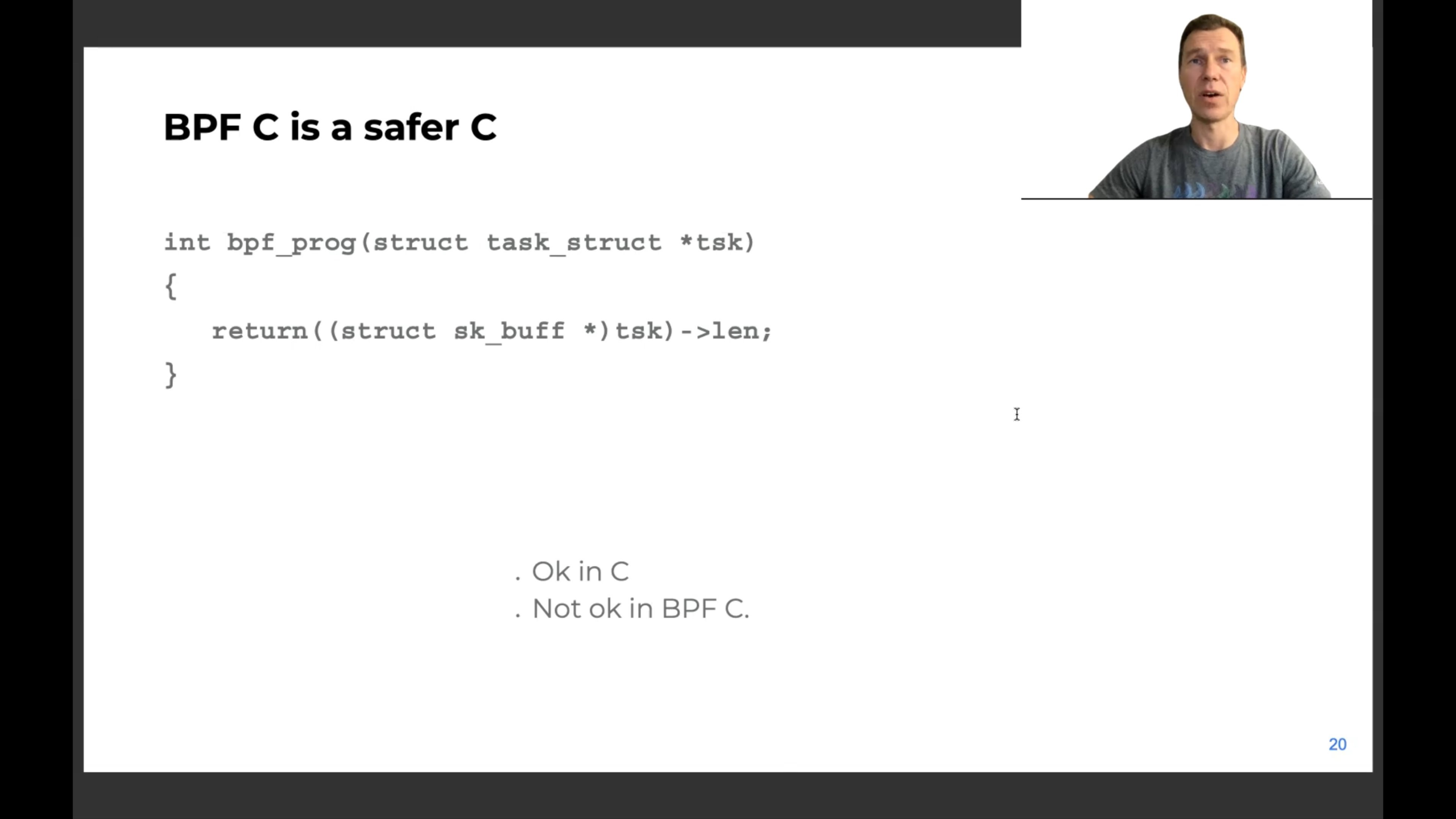Day 2开场的是eBPF创造者——Alexei Starovoitov大佬,他现在就职于Facebook,这次带来的主题是Safe programs. The foundation of BPF,翻译过来是,「安全编程是BPF的立根之本」。他强调了为什么eBPF能成为现在用来扩展内核功能的流行技术,居功至伟的就是BPF自身的验证器,程序加载到内核之前,验证器会检查程序是否安全,确保它们不会使内核崩溃,否则就不允许加载到内核中去。大家看我之前的博文里BPF程序的例子,出现频率最高的代码段就是内存访问边界的检查,你在普通C程序里基本看不到类似的,而在BPF程序里却是必要的。