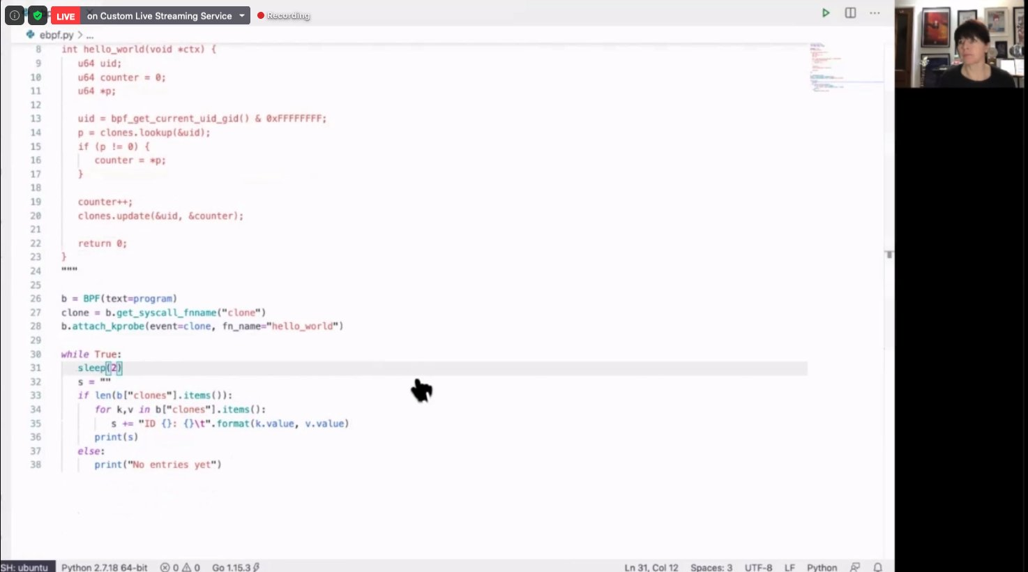 开场的是Liz Rice,容器圈闻名遐迩的技术女神,有着极为深厚的技术功底,YouTube上有很多她播放量很高的talk视频,建议大家都找来看看,她的talk特点就是讲技术深入浅出,配合live coding,让你感觉醍醐灌顶。之前就有过如何徒手用go语言实现一个container,这次也不例外,手写了一个通过attach kprobe钩子,观测clone这个syscall的BPF程序,随后又把它完善成基于BPF map存储当前触发系统调用的UID和相关次数,最后借助BCC,用Python写了读取BPF map的运行在用户空间的BPF程序。