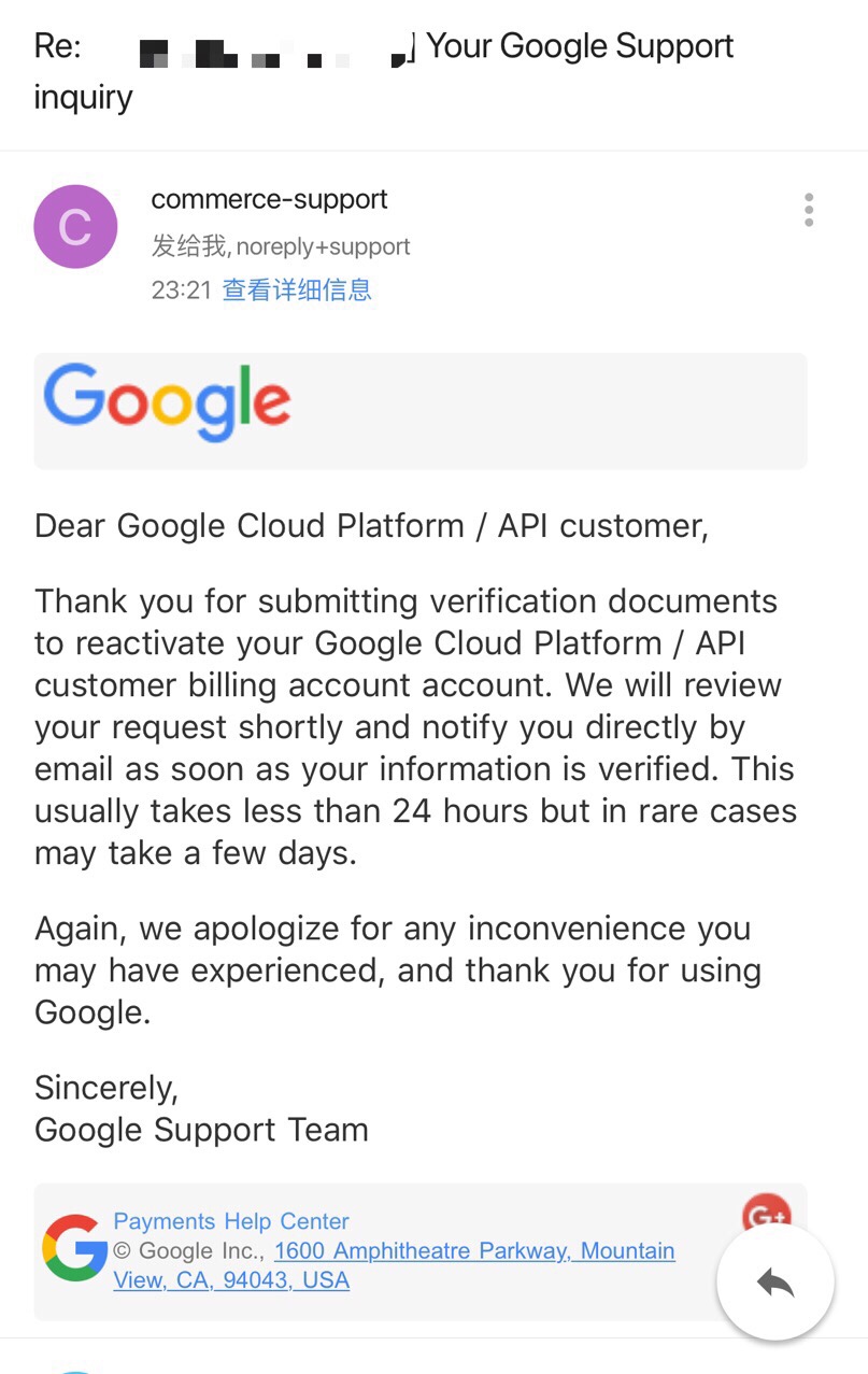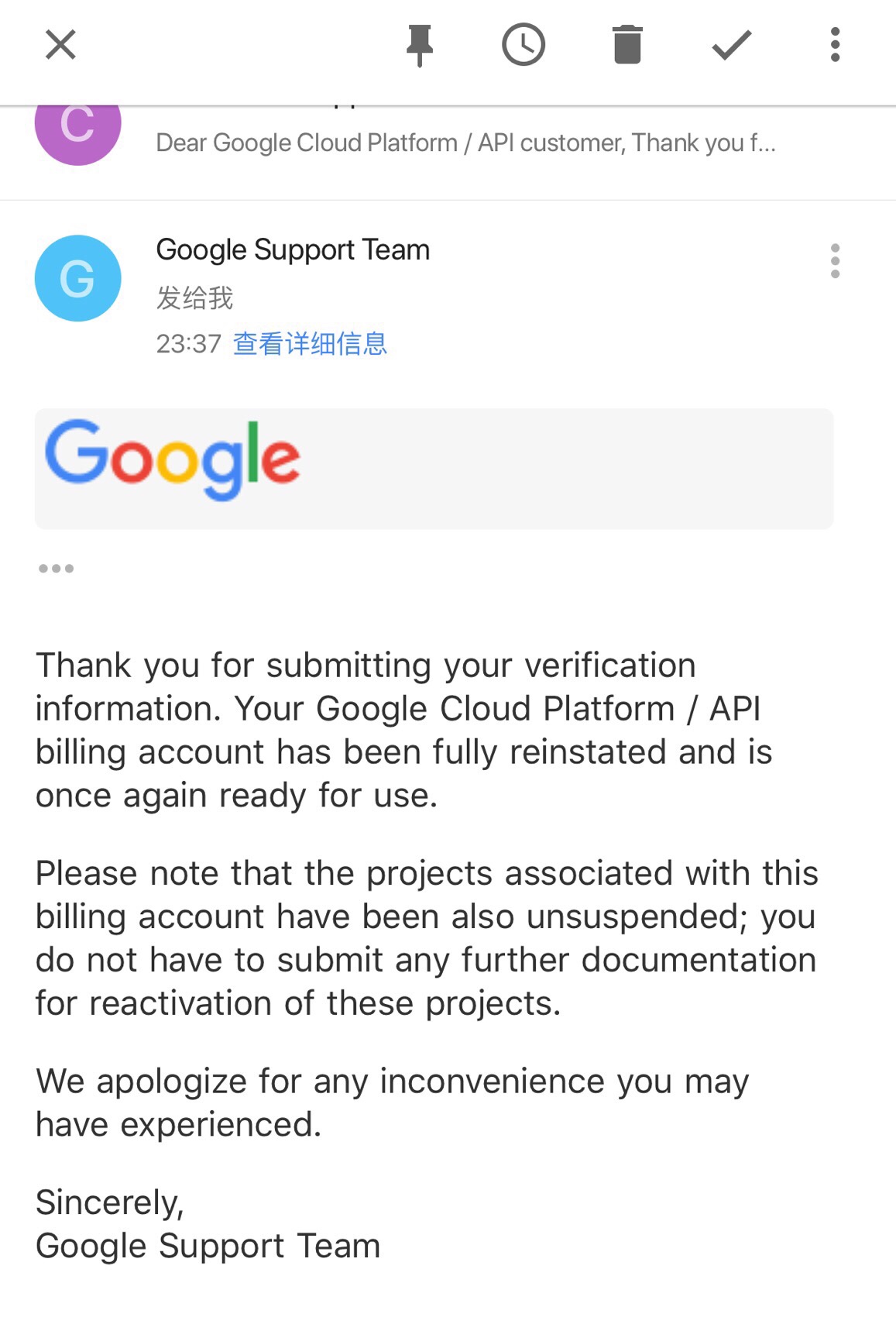 说是刚刚提交的申诉单已经验证通过了,包含赠送美刀的billing account可以正式使用咯!