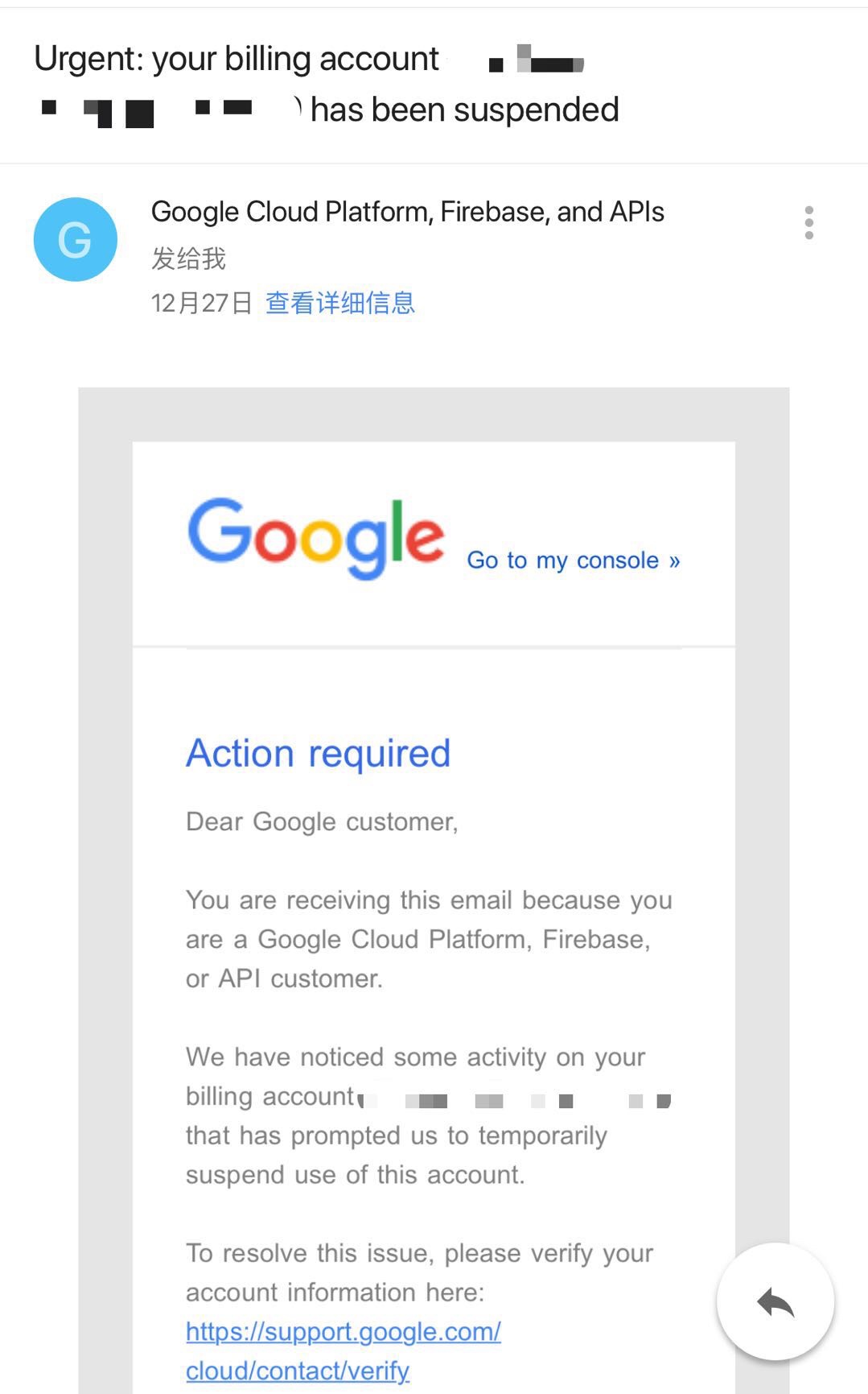 当你快方了的时候,永远要记得,google一下,你就有灵感了。果不其然,有些同学也遇到了类似问题,说是国内双币种信用卡都遇到这个问题了,但全币种卡没有问题。其中有位同学说是需要人肉验证,看看邮箱里有没有相关邮件,抱着试一试的态度,打开了gmail,果然发现一封邮件,说是billing account被停用,需要手动验证: