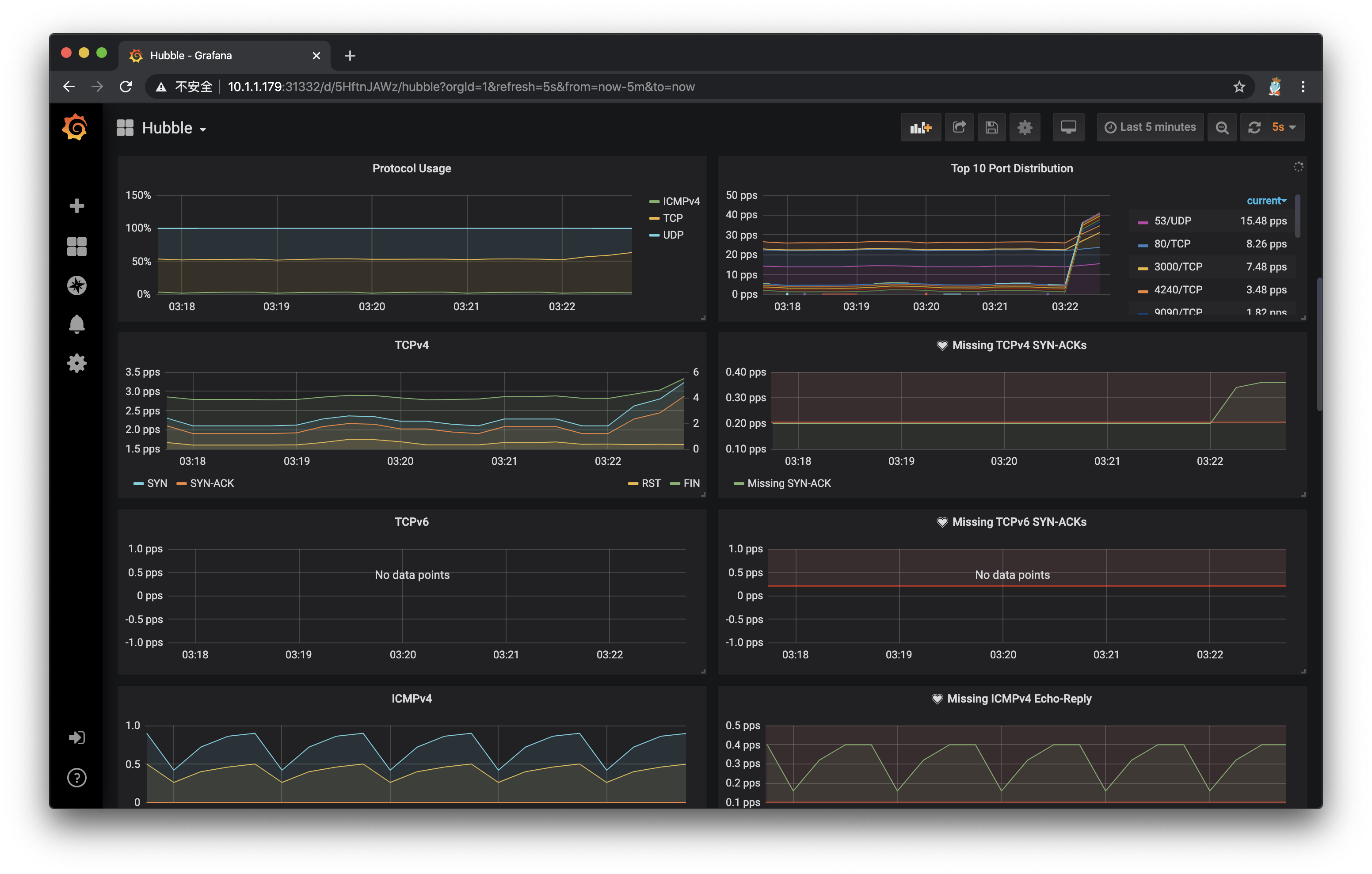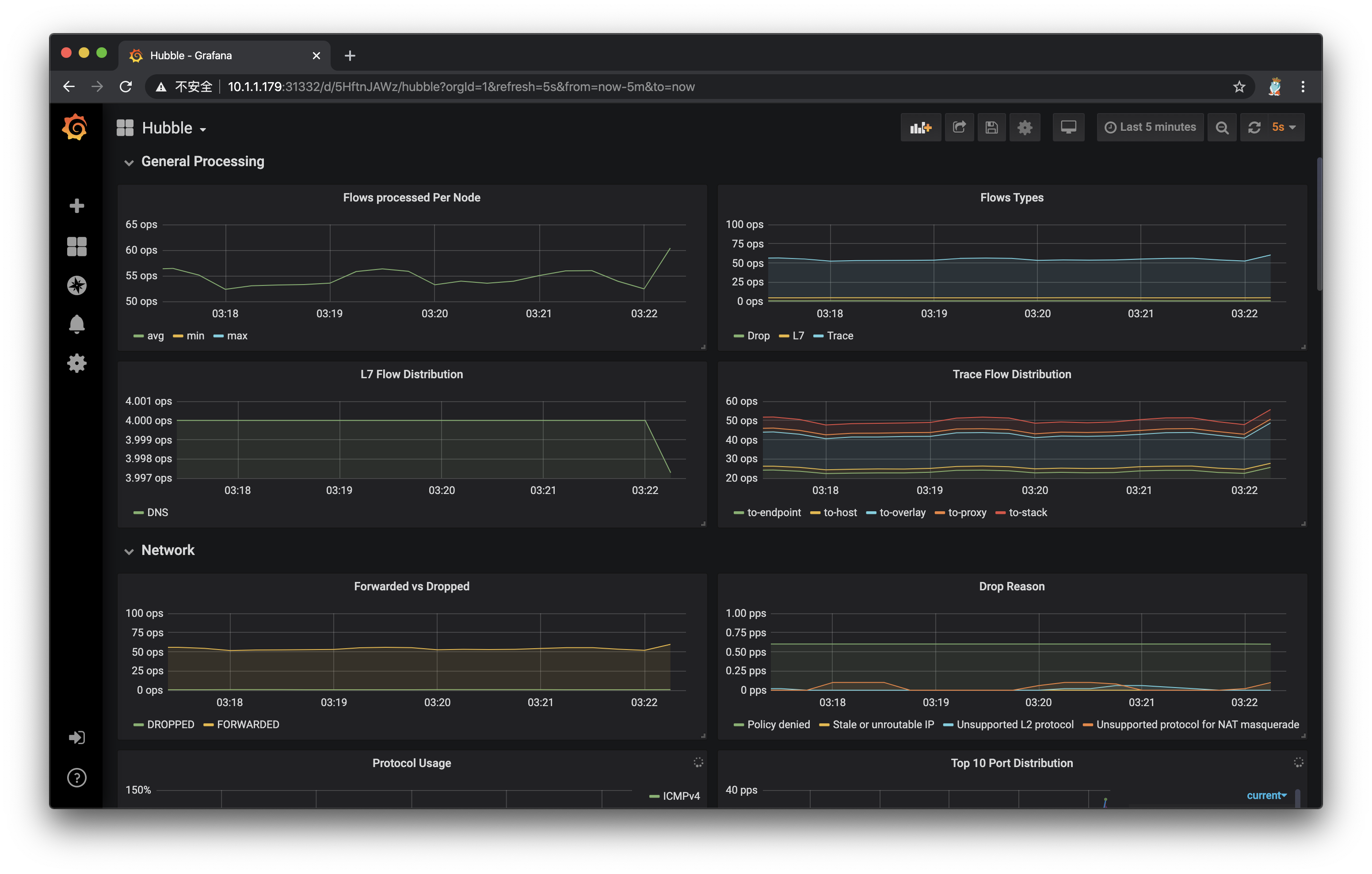 完成部署后,打开Grafana网页,导入官方制作的dashboard,可以快速创建基于Hubble的metrics监控。等待一段时间,就能在Grafana上看到数据了: