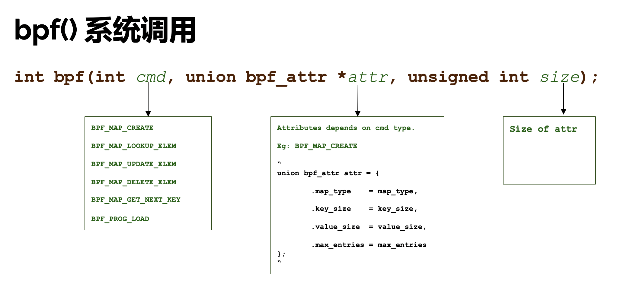 bpf_attr union 允许在内核和用户空间之间传递数据;确切的格式取决于 cmd 这个参数。size 这个参数表示bpf_attr union 这个对象以字节为单位的大小。