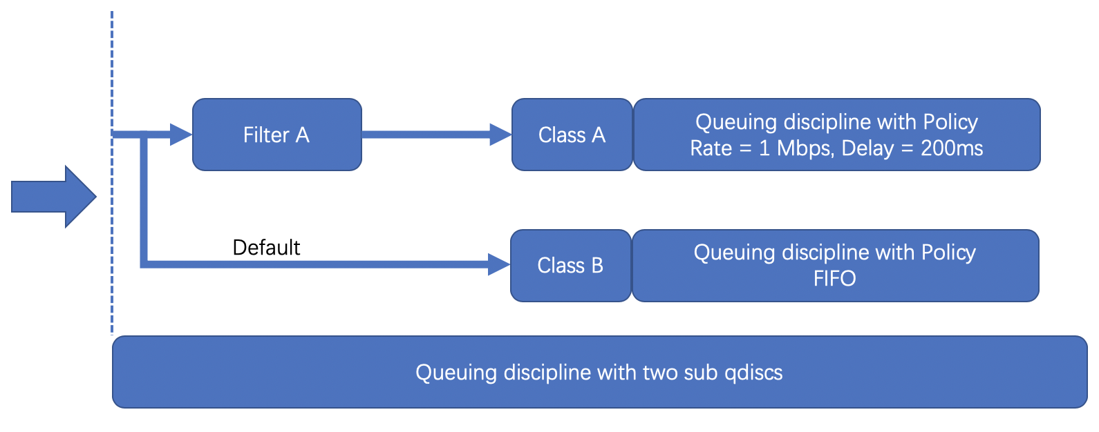 - Filters,直译是「过滤器」,它是用来过滤传入的网络包,使它们进入到对应class的qdisc中去。